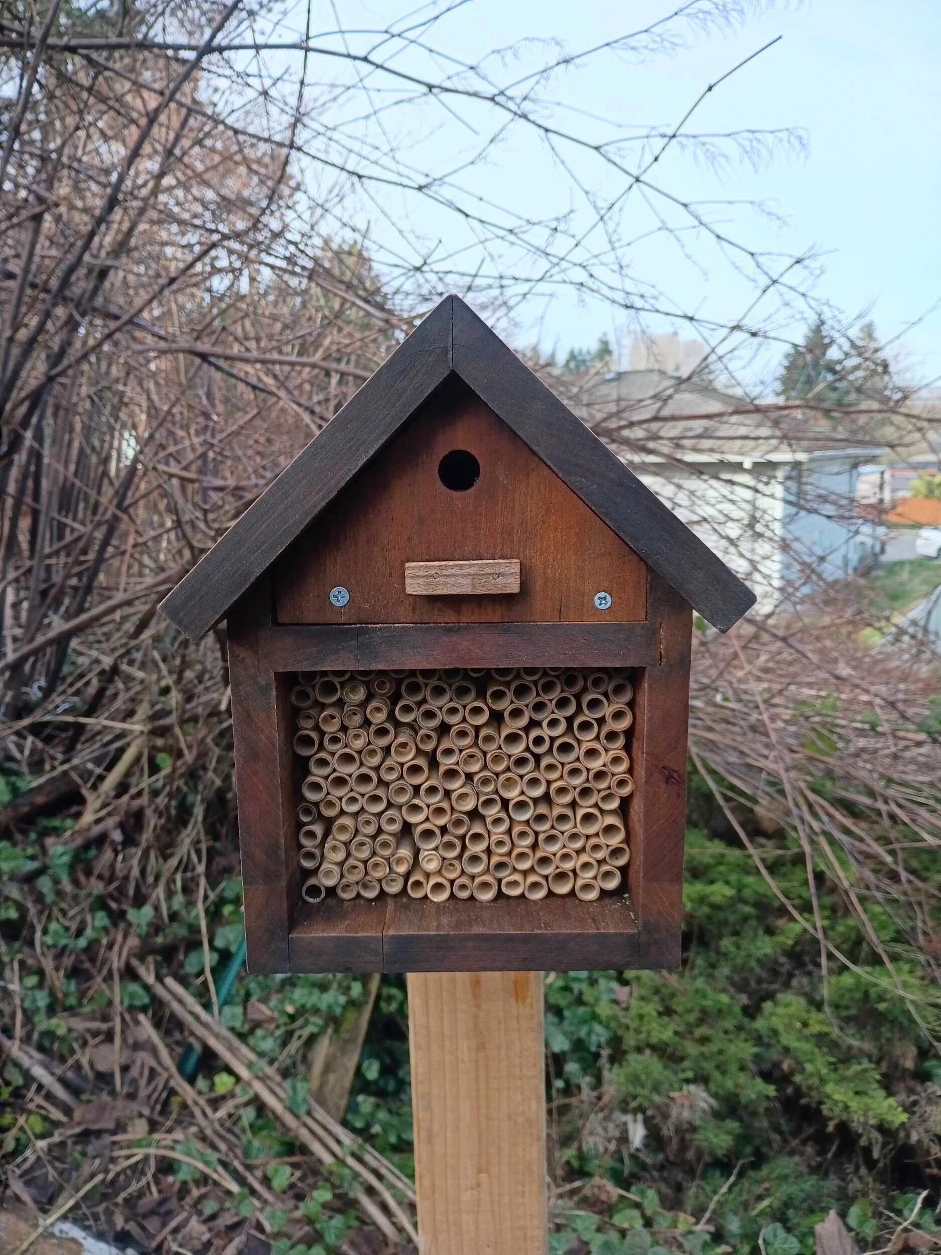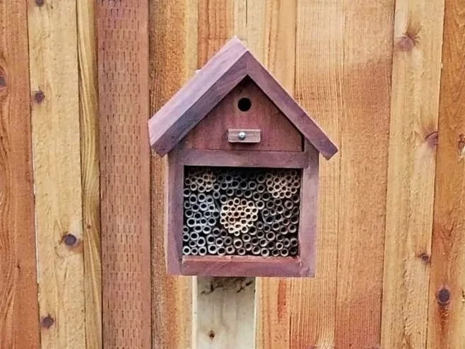Be mindful of predation! Hungry birds may peck the bee house reeds for a quick snack. If this is occurring, placing a mesh screen over the reeds can help. We are happy to install one if your bee house becomes a target.
